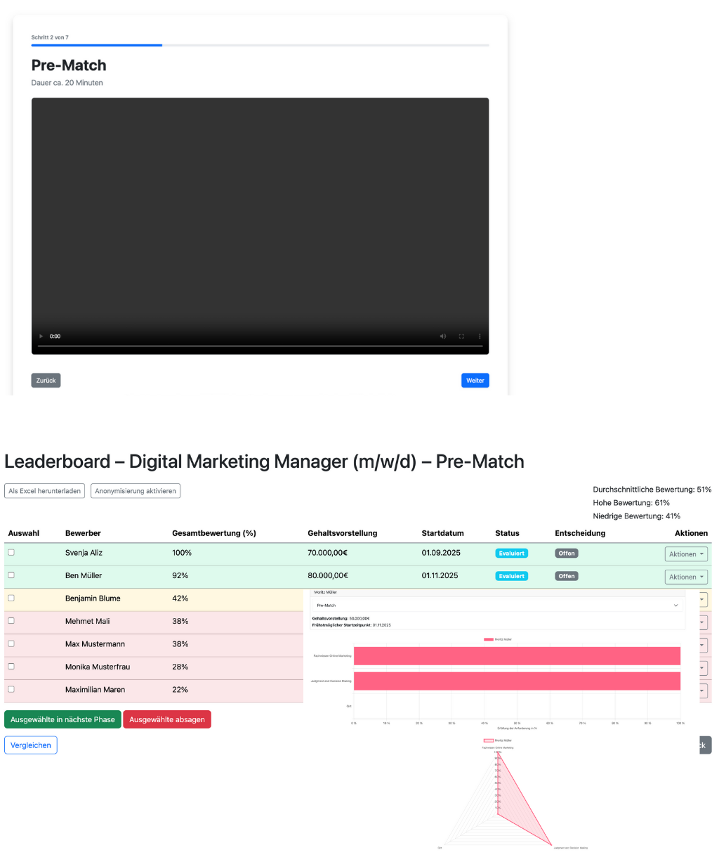 Unsere Cloud-based Software bewertet die Antworten datenbasiert und objektiv anhand von uns entwickelter Antwortschemata. Sie erhalten sowohl ein übersichtliches Dashboard als auch Insights in die Detailergebnisse und können somit schneller, fairer und treffsicherer entscheiden.